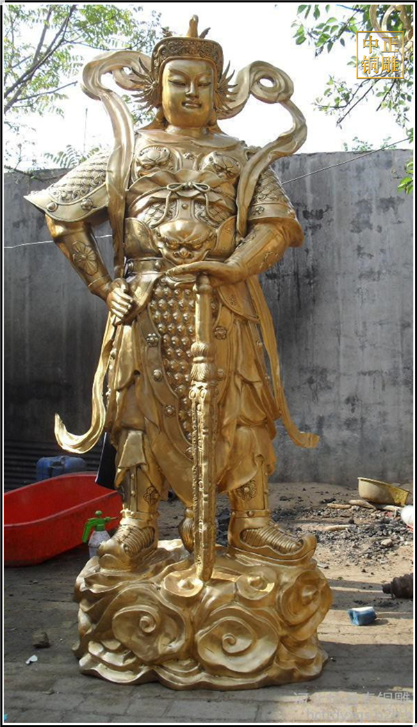 于是,韋陀被人們稱為護(hù)法菩薩。在中國(guó)的寺院殿宇里原印度血統(tǒng)的銅雕佛像韋陀已經(jīng)漢化了,成了一名地道的中國(guó)武將,英俊威武。他身披鎧甲,手持金剛杵,降魔去妖,威風(fēng)凜凜。天王殿中所塑的韋陀,一般具有兩種站立的姿態(tài),一個(gè)是雙手合十,橫杵于腕上,直挺而立;一個(gè)是一手握杵拄地,另一手叉腰。