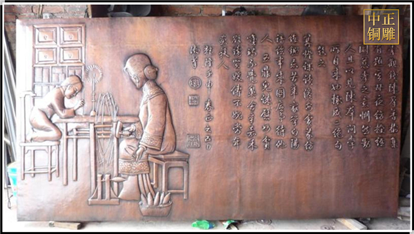 銅浮雕能夠承載更多的內容,它打破了傳統雕塑內容單一的缺點,可以像繪畫一樣繪制出豐富的內容,能夠通過銅浮雕將事件、繪畫、文化等濃縮到整畫中去,從而形成一種全新的藝術形式.中正銅雕-銅浮雕定做、銅浮雕定做價格、銅浮雕定做廠家,我公司集科研、開發設計、普通鑄造、一次性整體澆鑄、精密鑄造于一體。本公司技術力量雄厚,設備,不但重視中國青銅器原有的藝術風格,還繼承了文物原有的藝術品味,在繼承和發揚古老文化的同時,更深一步為新老客戶定身量制各種銅制、鐵制工藝品等產品,曾多次受到寺廟長老和美術學院教授的好評。