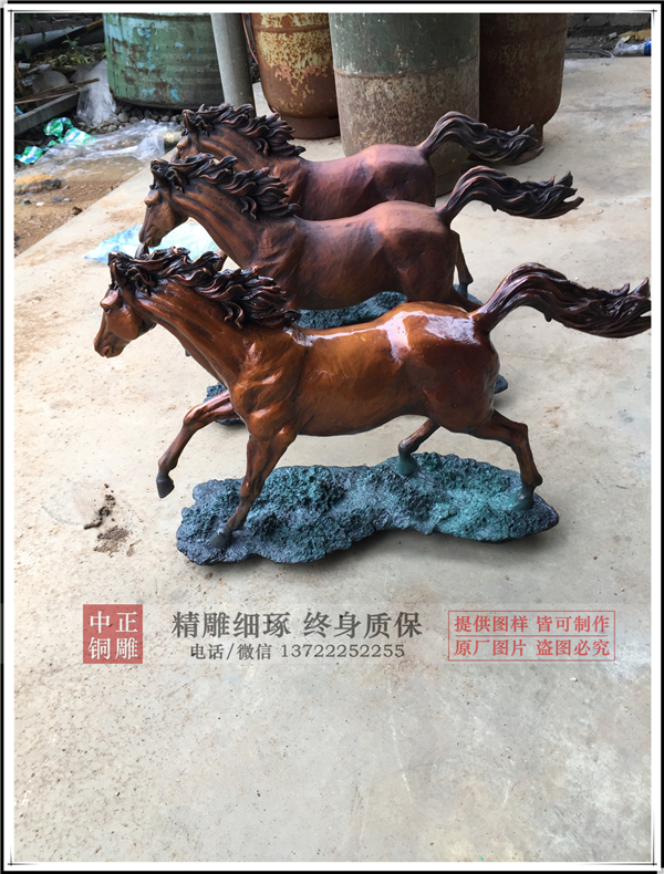 馬到成功是人們對馬能夠帶來好運的一種說法,家里放一些馬的裝飾品效果也很好。馬要放在驛馬方,也就是南方和西北方向,有益于運氣的帶動。馬的數(shù)量以二、三、六、八、九匹為宜,這都是古人認(rèn)為能帶來吉運的好數(shù)字,而六匹馬是最吉利的。因為“六”與“祿”同音,有“祿馬交馳”的寓意,同理,五匹馬是“五馬分尸”的意思,切忌擺五匹馬。中正銅雕-工藝品銅馬,大型工藝品銅馬,工藝品銅馬雕塑,我廠成立于2014年.我公司是唐縣銅雕的知名企業(yè),主要以各種大型銅雕鑄造加工于一體.主要產(chǎn)品有,寺廟佛像、香爐、銅鐘、城市雕塑、動物雕塑、偉人雕塑、西方人物、銅浮雕等,品種齊全,價格合理。